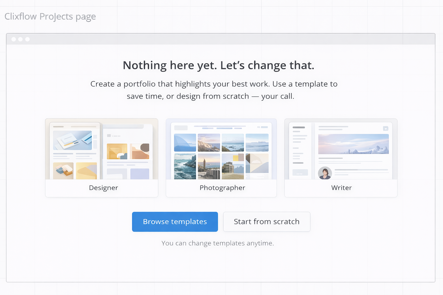 After a user signs up and completes their onboarding form, they’re taken to an empty state screen that will eventually contain all of their projects. As part of efforts to improve its UX, Clixflow was intending to create customized first-use empty states based on user answers to the form.