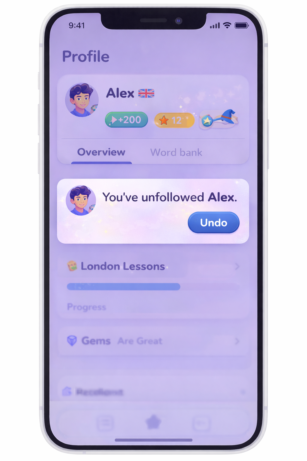 A subtle toast for unfollowing another learner, with an immediate undo option to reduce anxiety around social actions.
