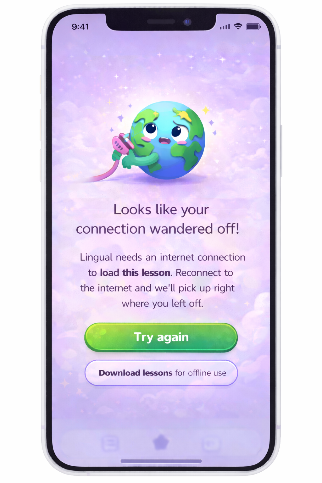 A calm, reassuring full-screen state when a lesson fails to load due to lost internet, emphasizing continuity and minimizing disruption.