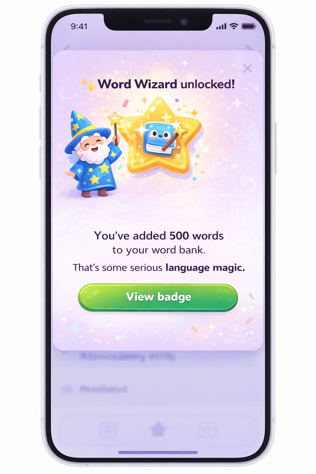 A celebratory pop-up for earning the Word Wizard badge after reaching 500 words, reinforcing motivation with positive language and visual delight.