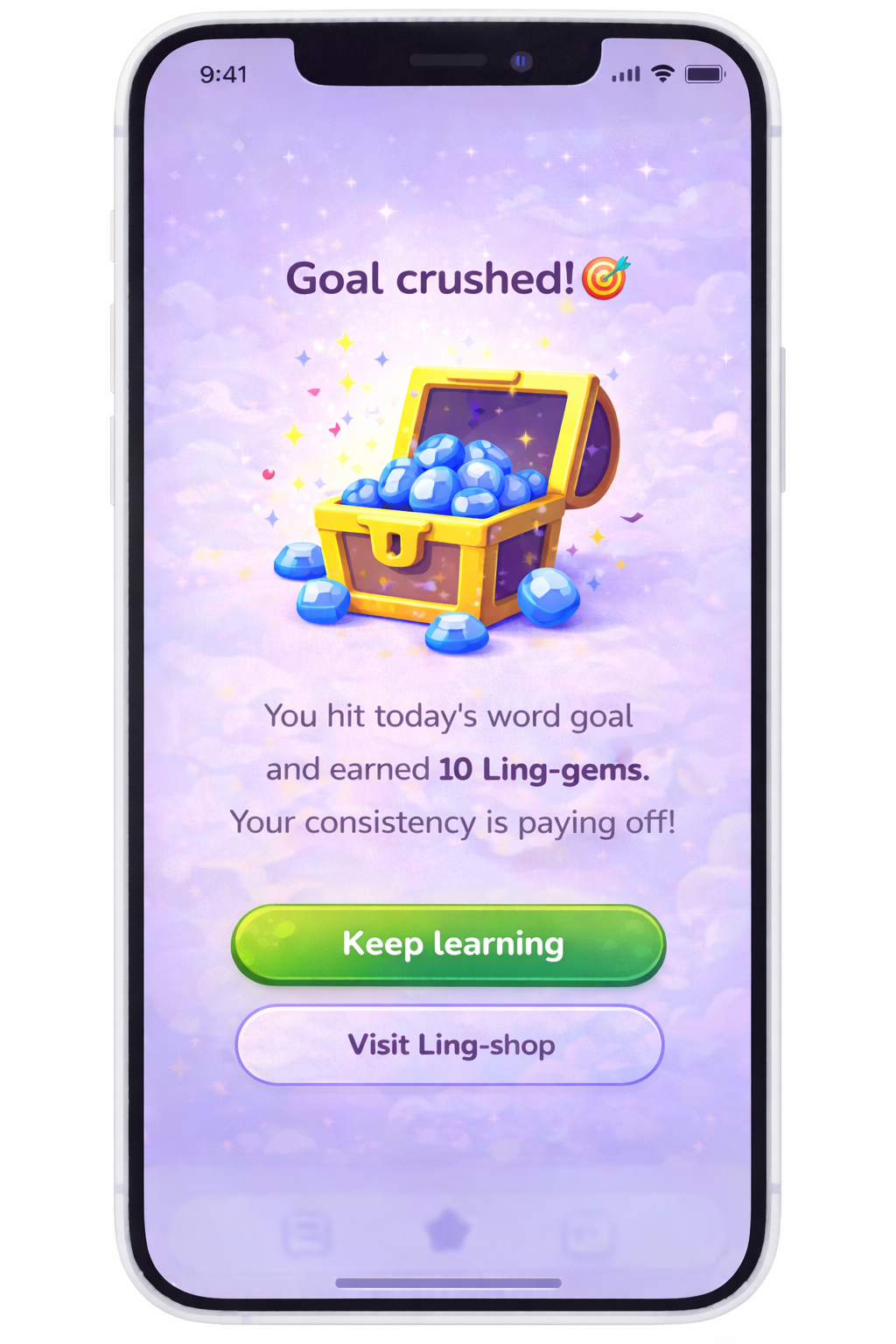 A rewarding moment when users hit their daily word goal, pairing earned Ling-gems with encouragement to keep learning or explore rewards.